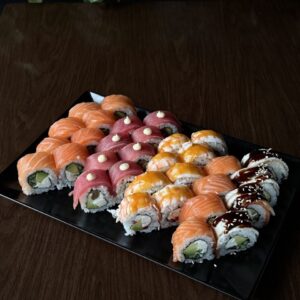 роли філадельфія: з лососем, з креветками, з тунцем, та рол мікс лосося з вугрем.