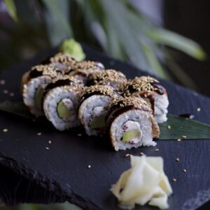 вугор,рис,авокадо,крем-сир,норі,ікра тобіко,унагі,кунжут.