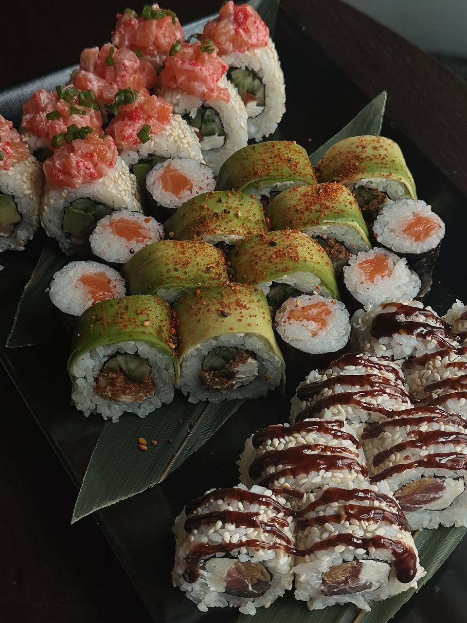 рол з авокадо,смаженим лососем теріякі.