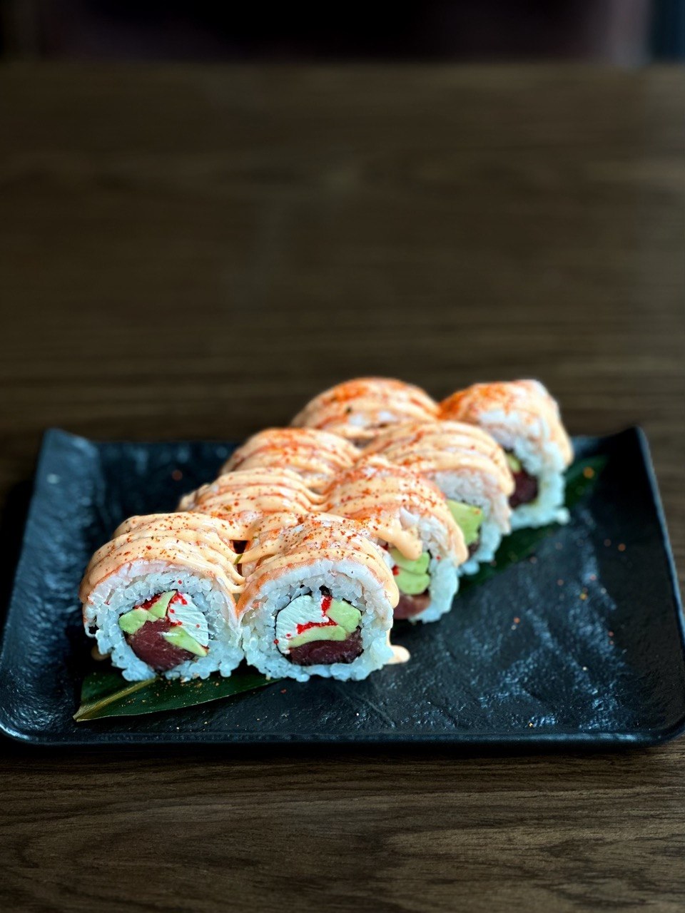 свіжий тунець,рис,ікра тобіко,авокадо,норі,огірок,норі,японський майонез.