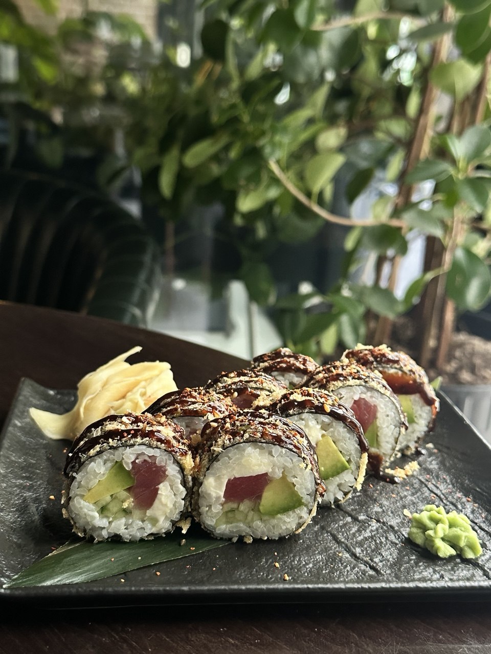 тунець свіжий,рис,крем-сир,огірок,авокадо,норі,сухарі панко,соус унагі, імбир та васабі.