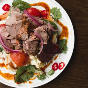 Яловичина слайсами (ростбіф), яєшня скрамбл, чері, крем-сир, соус вітело, зелень,цибуля,кінза та чилі.