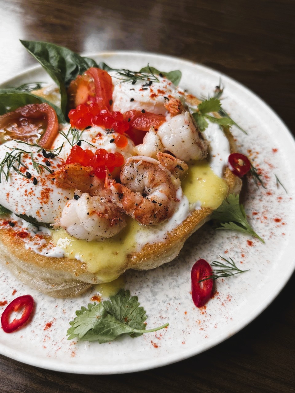 Креветки,авокадо,чері,зелень,яйця пашот,соус на основі йогурту часнику та кропу, цитрусовий соус,паляниця,ікра декор, чилі та кінза.