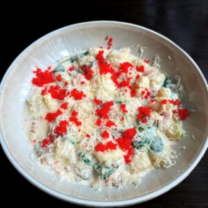 Ньоки,вершки,лосось,шпинат свіжий,ікра тобіко, сир королівський.